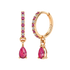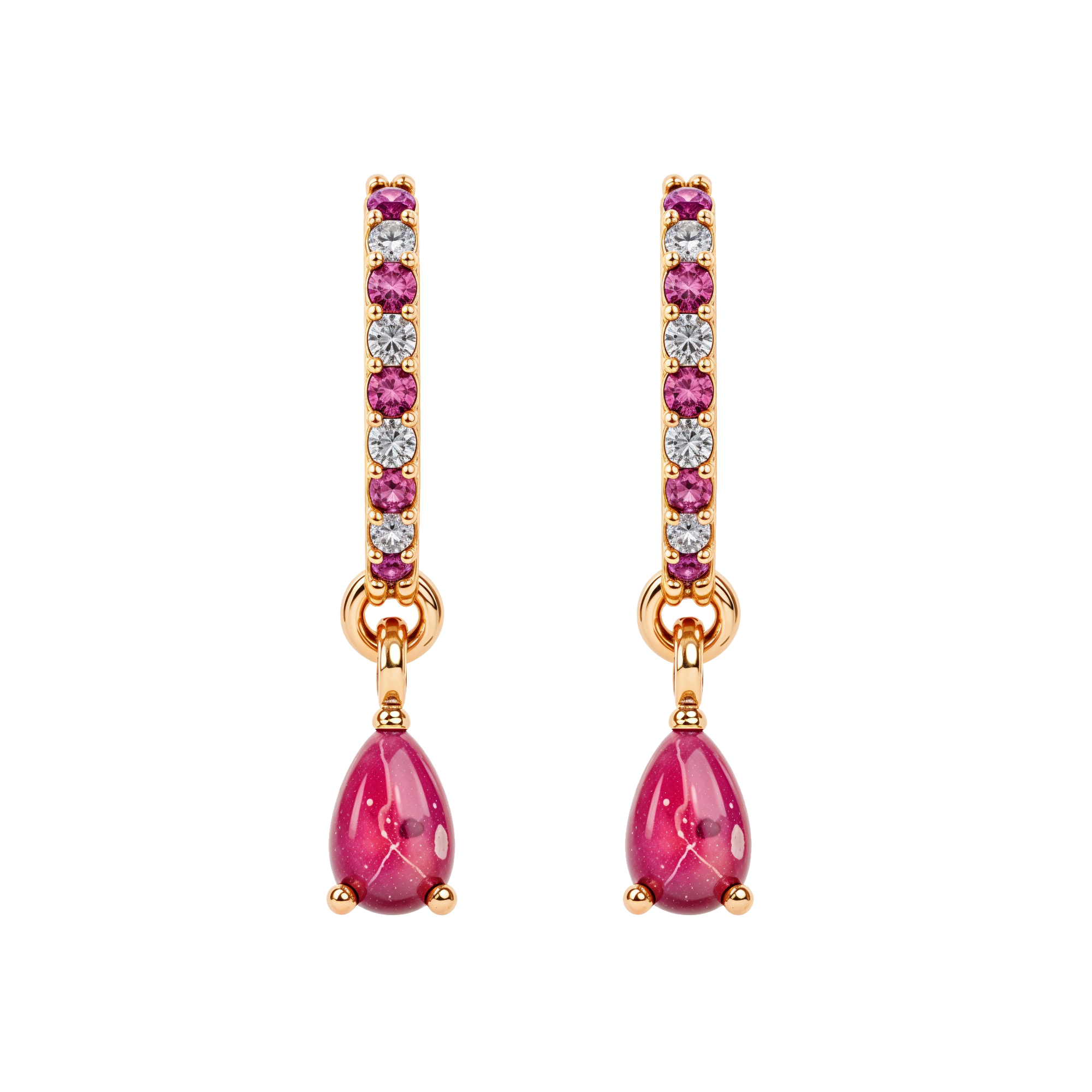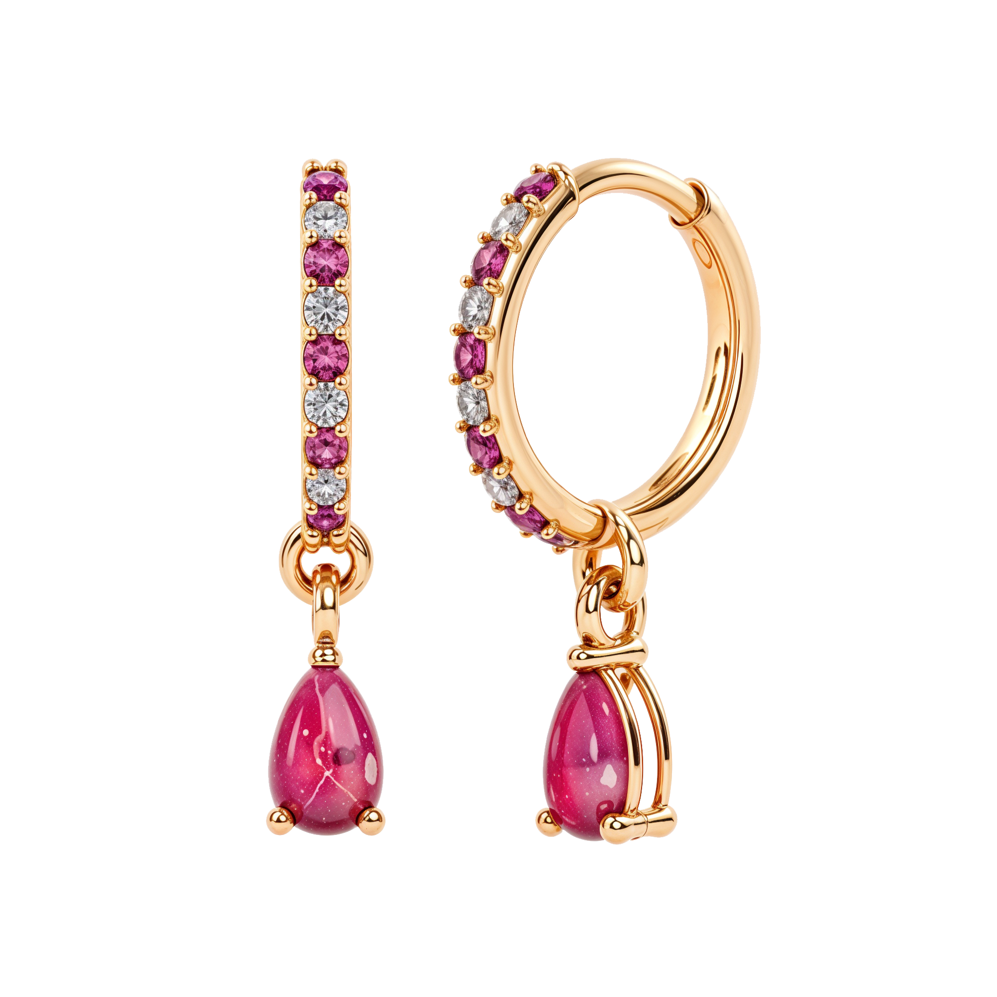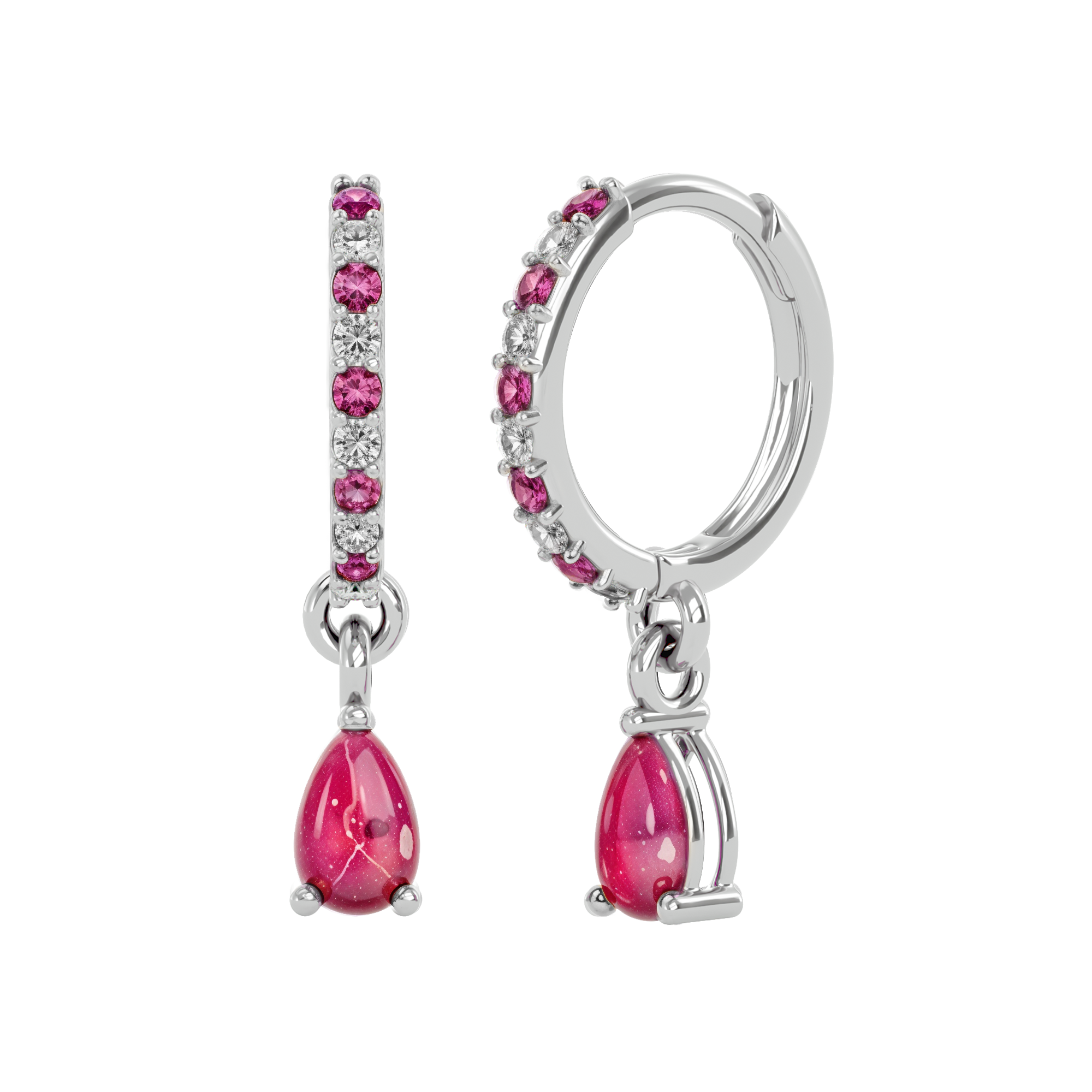 These sterling silver huggies are made to be noticed — but never loud. Featuring deep, pear-cut rubies surrounded by a halo of cubic zirconia, they offer a rich pop of color with a timeless, radiant shimmer.