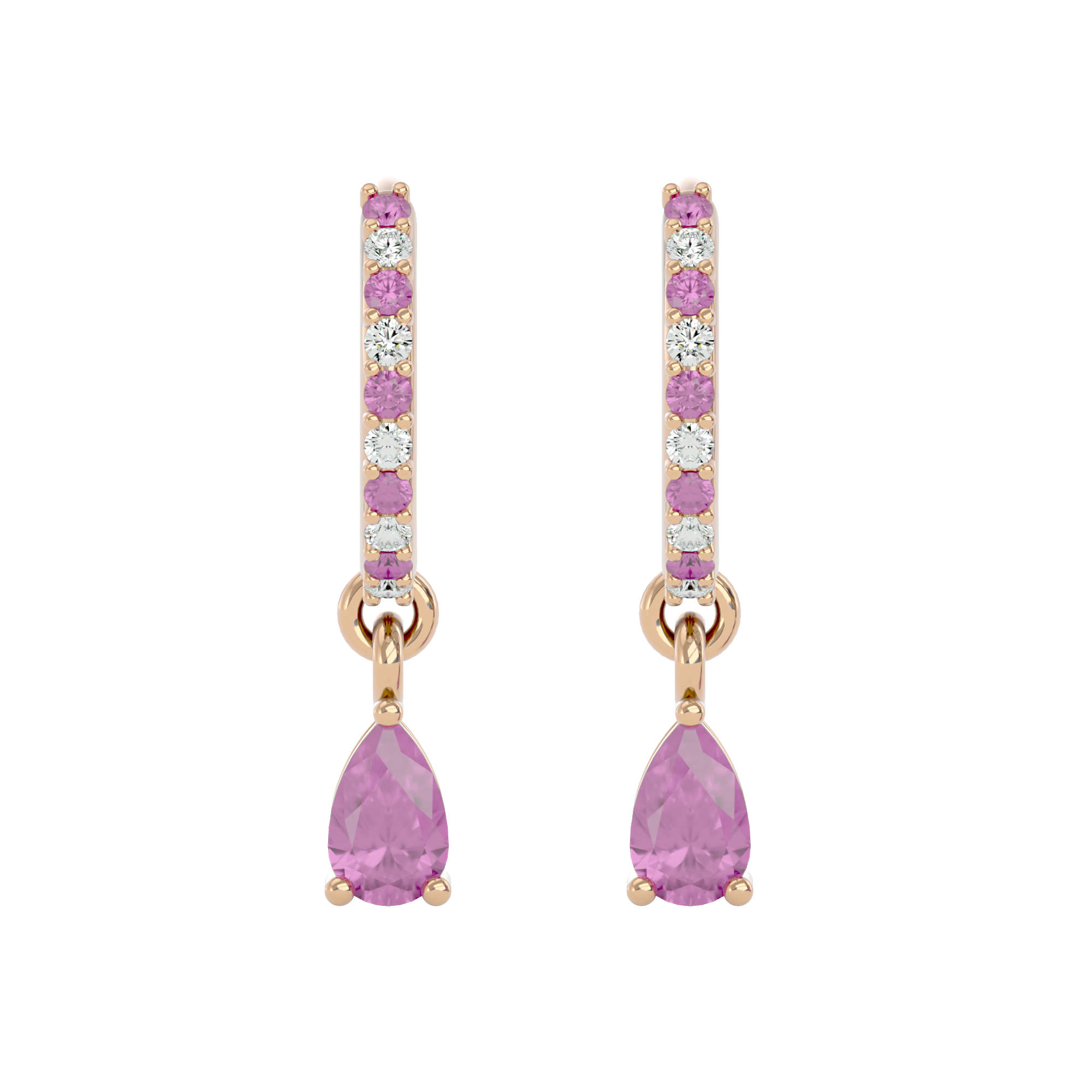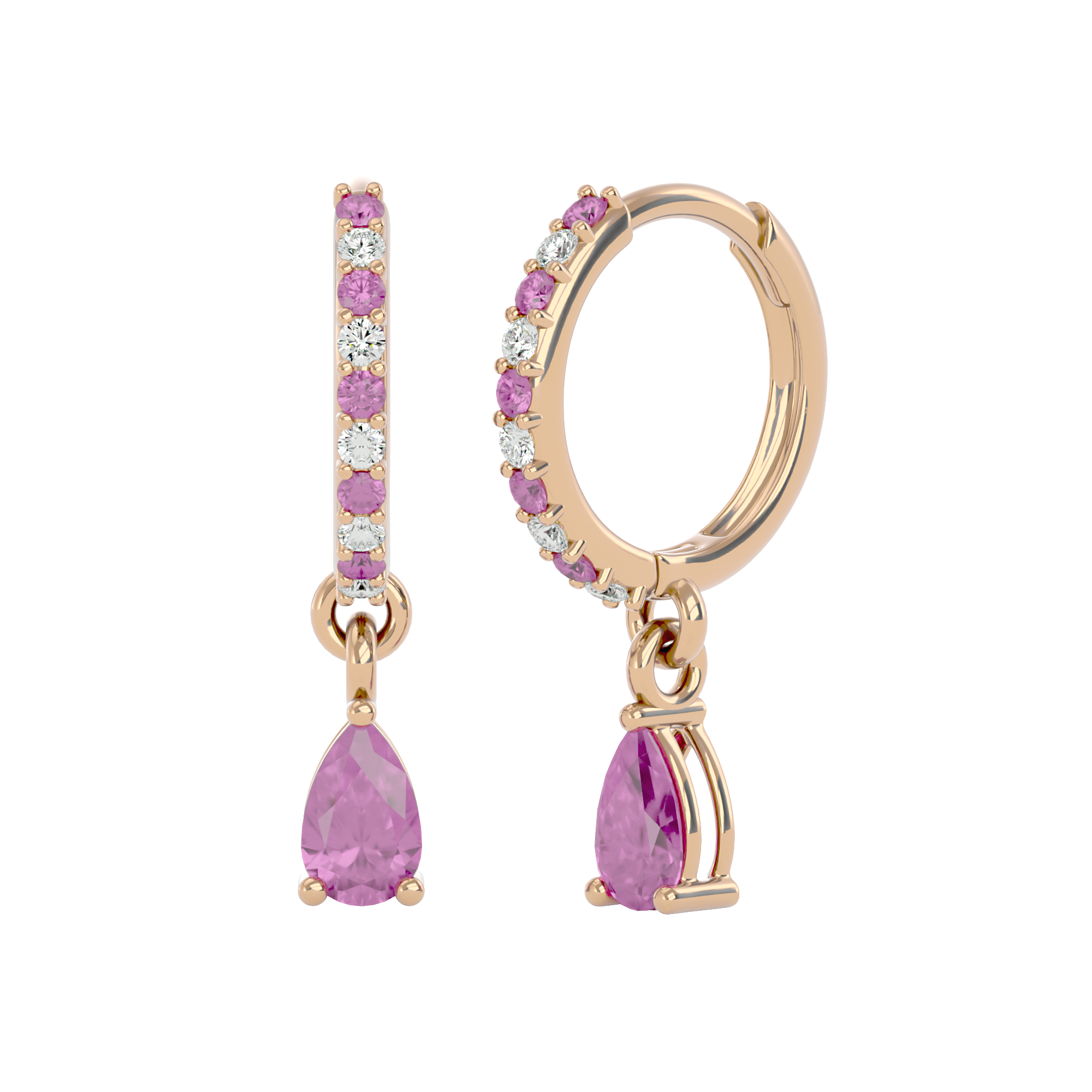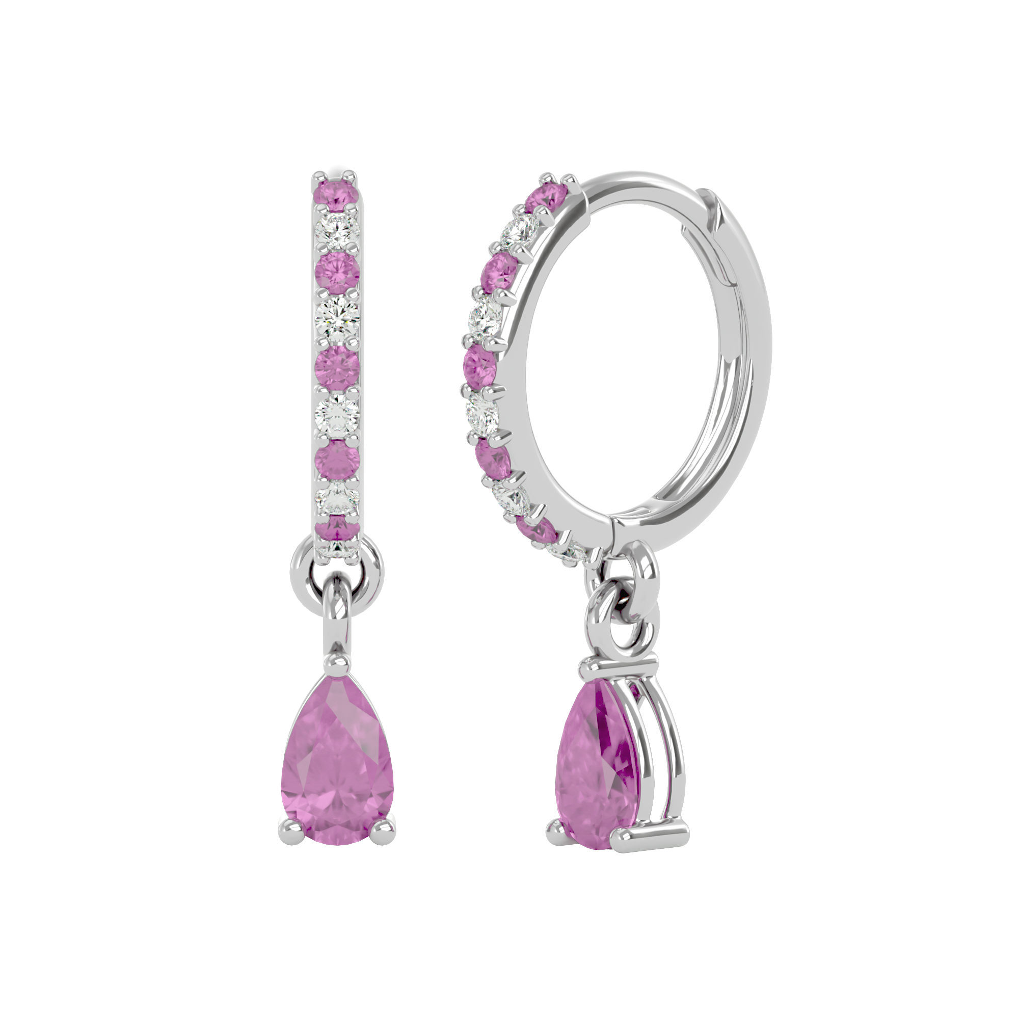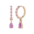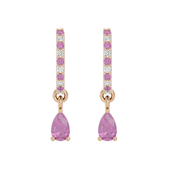 These sterling silver huggies are made to be noticed — but never loud. Featuring radiant, pear-cut pink tourmalines surrounded by a halo of cubic zirconia, they offer a playful pop of color with a soft, romantic shimmer.