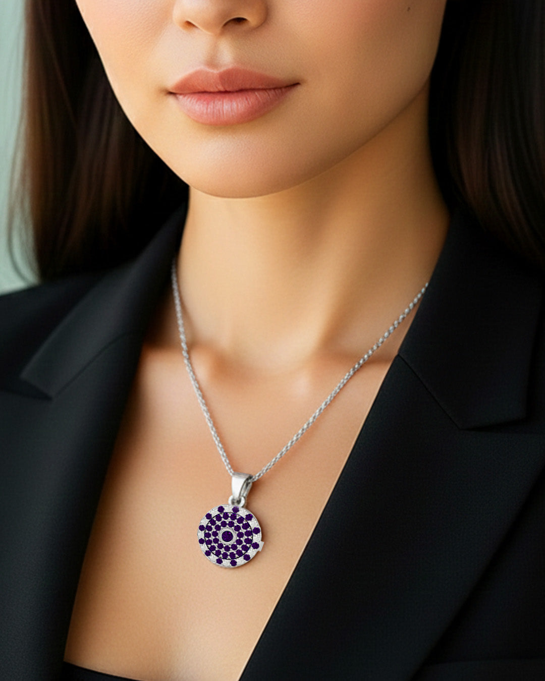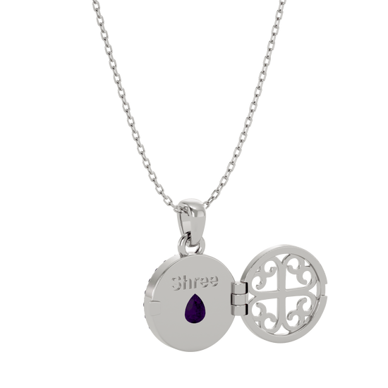 This delicate amethyst locket is more than just a necklace — it’s a quiet reflection of inner peace. At its centre sits a radiant round amethyst, cherished for its calming energy and spiritual depth. It’s gently framed by shimmering cubic zirconia, giving it a soft, graceful sparkle.