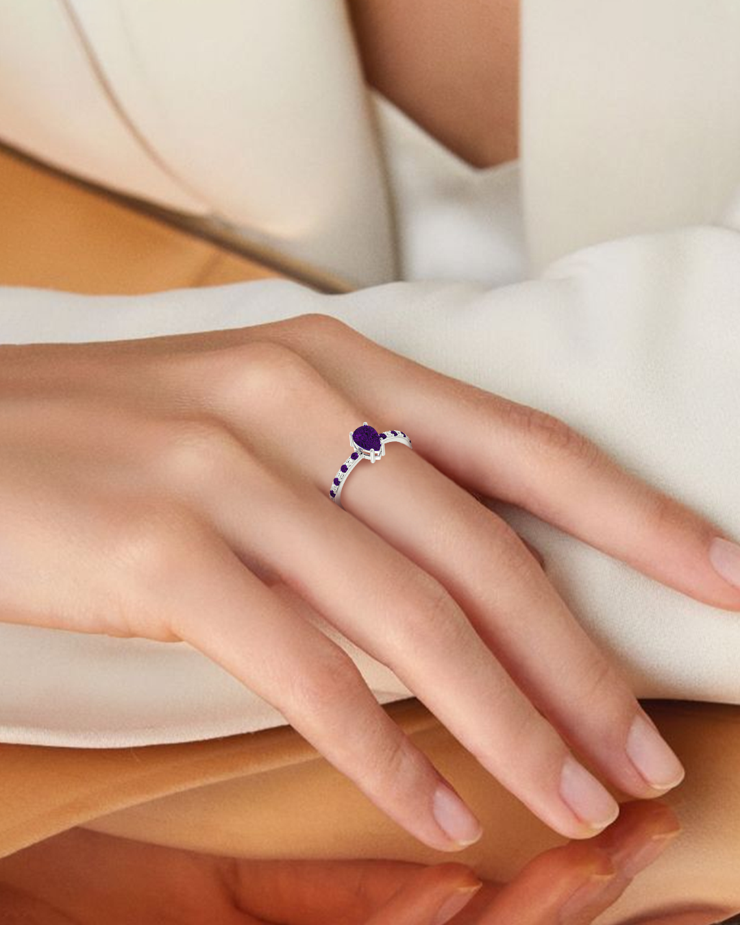 There’s something truly enchanting about this piece. At its heart is a gorgeous deep purple amethyst — a stone renowned for its qualities of peace, balance, and wisdom. It’s elegantly framed by sparkling cubic zirconia that catch the light beautifully, adding just the right amount of shimmer.