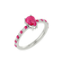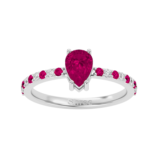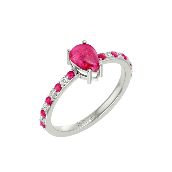 There’s a fierce beauty in this piece. At its center glows a deep crimson ruby — a stone long treasured as a symbol of passion, strength, and love that endures. Its rich, fiery hue draws you in, while surrounding cubic zirconia add a graceful sparkle, like embers catching the light.