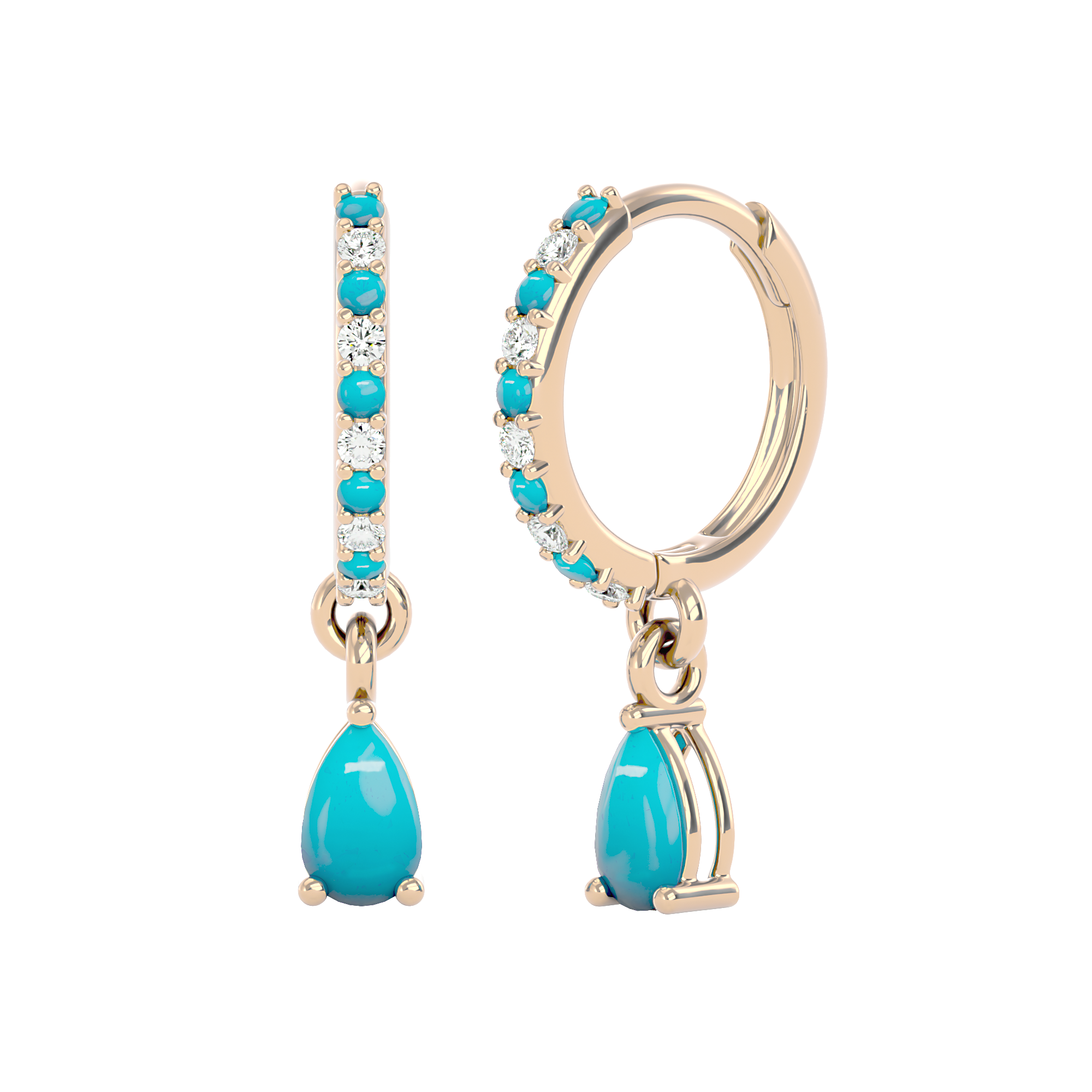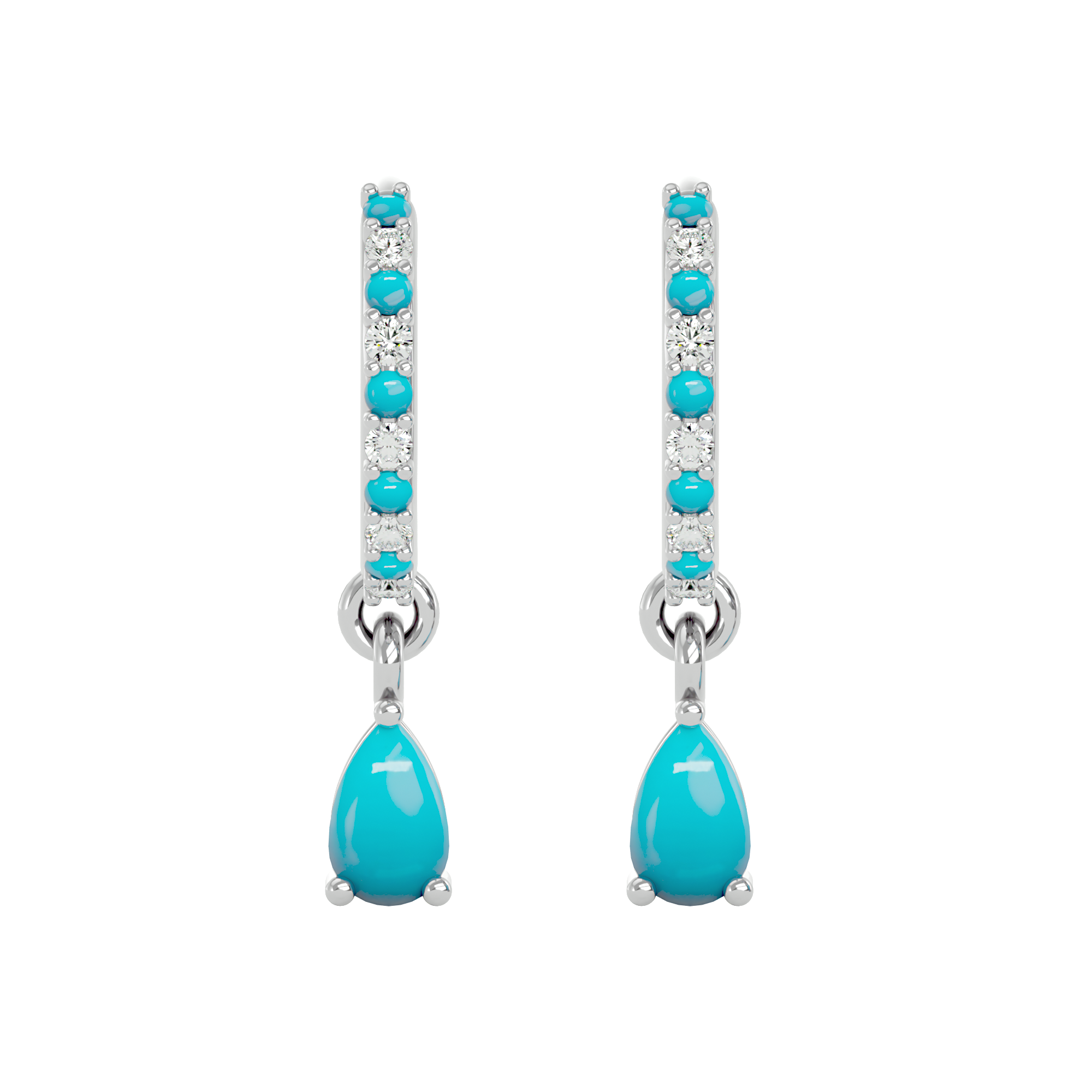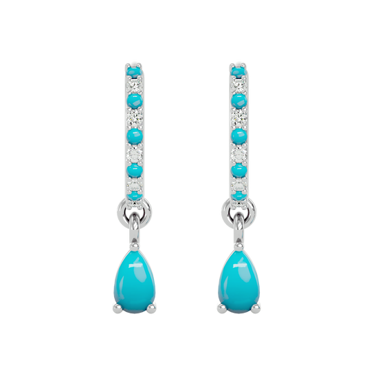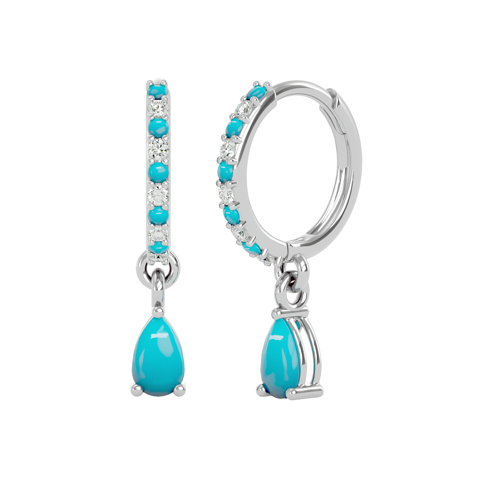 These sterling silver huggies are made to be noticed — but never loud. Featuring vibrant, pear-cut turquoise stones surrounded by a halo of cubic zirconia, they offer a fresh pop of color with a bright, breezy shimmer.